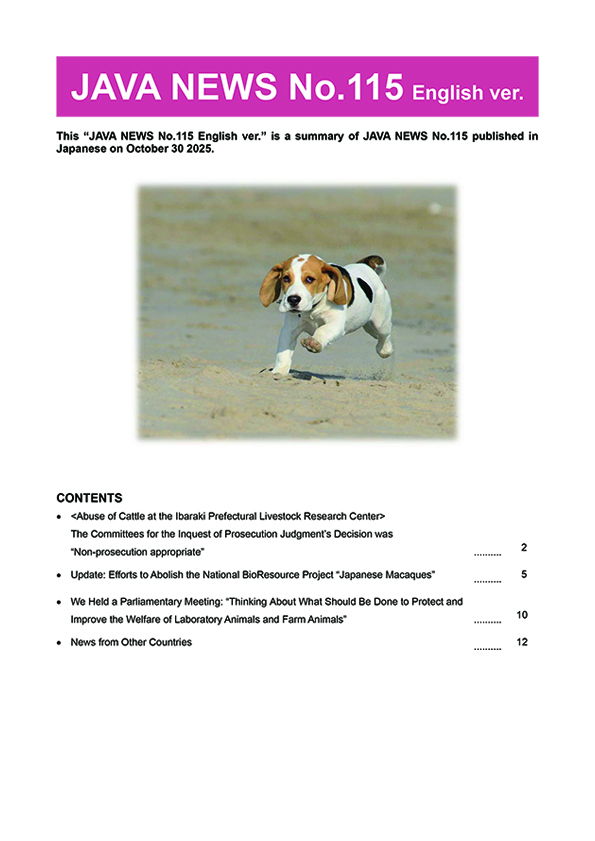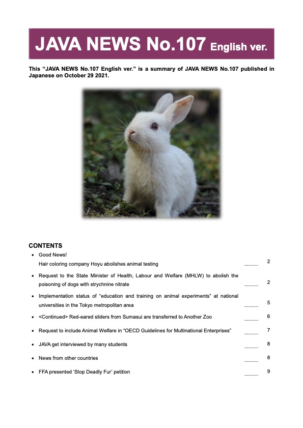Established in 1986, the Japan Anti-Vivisection Association (JAVA) is a nation-wide citizen group dedicated to protecting animals and our mission to stop all animal testing.